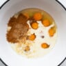 Next, crack the eggs into a large bowl and whisk them together. Add the milk, maple syrup, cinnamon, nutmeg, ginger, and salt to the eggs and whisk to combine.
