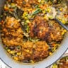 - If the rice is still crunchy after removing the skillet from the oven, remove the chicken from the skillet, add an additional ½ cup of broth to the skillet, mix, and cover. Let the rice sit for 15 minutes to allow the rice to further cook.