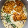 For the chicken in this chicken pot pie skillet, we’re using boneless skinless chicken thighs and breading them in an amazing cornflake mixture en lieu of traditional biscuits. they’re super flavorful, crispy, and just such a perfect complement to the filling.