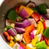 Next, prepare the veggies. Place the chopped peppers, purple onion, and garlic cloves into a large bowl. Set aside.