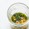 Make the veggie marinade and add the olive oil, sesame oil, lime juice, garlic, ginger, salt, rice vinegar, cilantro, and honey to a mason jar. Cover the jar and shake until combined.